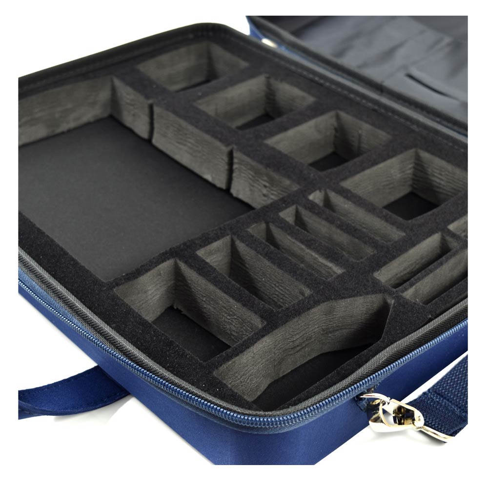 Maleta revestida em EVA termomoldado, equipada com um berço de EVA customizado, cortes técnicos precisos que acomodam e protegem individualmente cada produto, garantindo que permaneçam firmemente no lugar durante o transporte.
